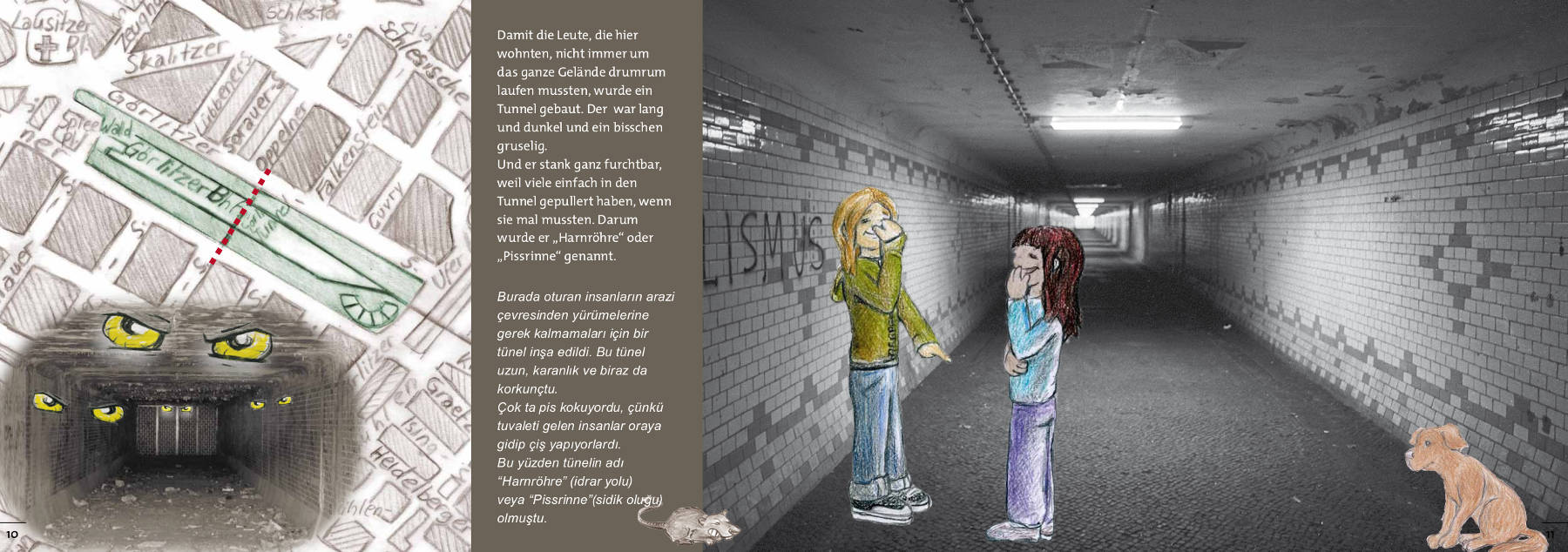 Damit die Leute, die hier wohnten, nicht immer um das ganze Gelände drumrum laufen mussten, wurde ein Tunnel gebaut. Der war lang und dunkel und ein bisschen gruselig.