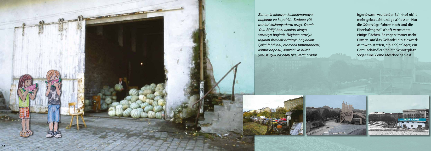 Irgendwann wurde der Bahnhof nicht mehr gebraucht und geschlossen. Nur die Güterzüge fuhren noch und die Eisenbahngesellschaft vermietete einige Flächen. So zogen immer mehr Firmen auf das Gelände: ein Kieswerk, Autowerkstätten, ein Kohlenlager, ein Gemüsehändler und ein Schrottplatz. Sogar eine kleine Moschee gab es!