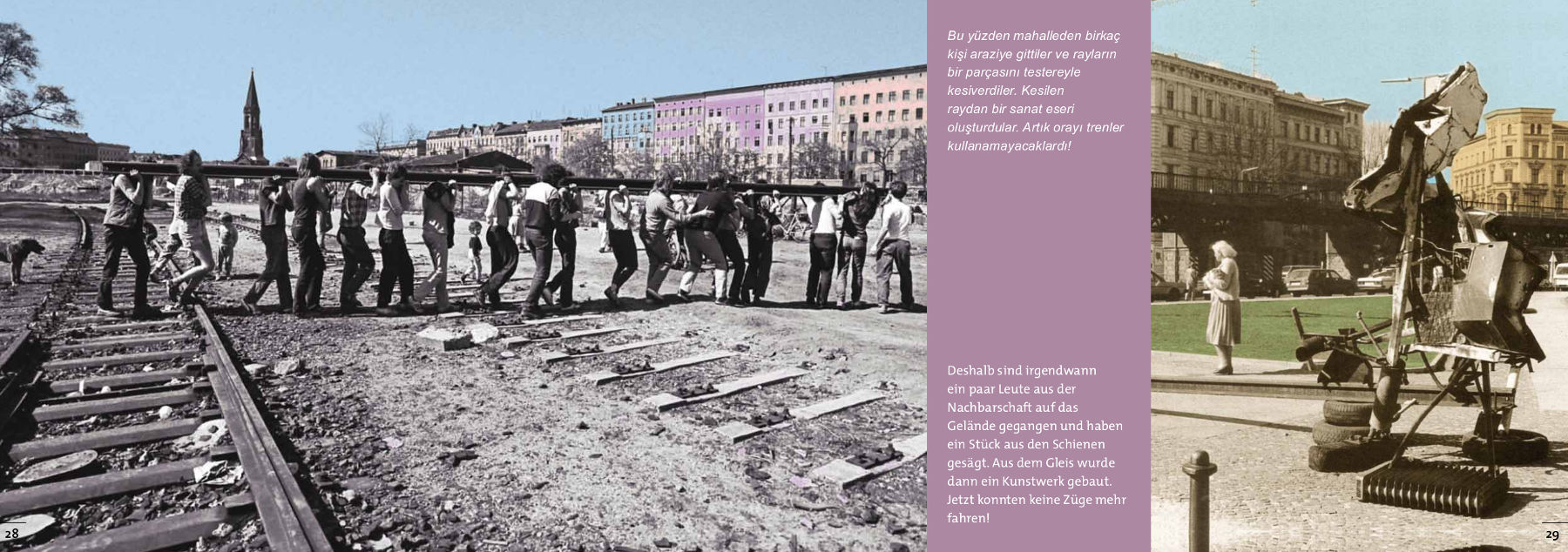Deshalb sind irgendwann ein paar Leute aus der Nachbarschaft auf das Gelände gegangen und haben ein Stück aus den Schienen gesägt. Aus dem Gleis wurde dann ein Kunstwerk gebaut. Jetzt konnten keine Züge mehr fahren!
