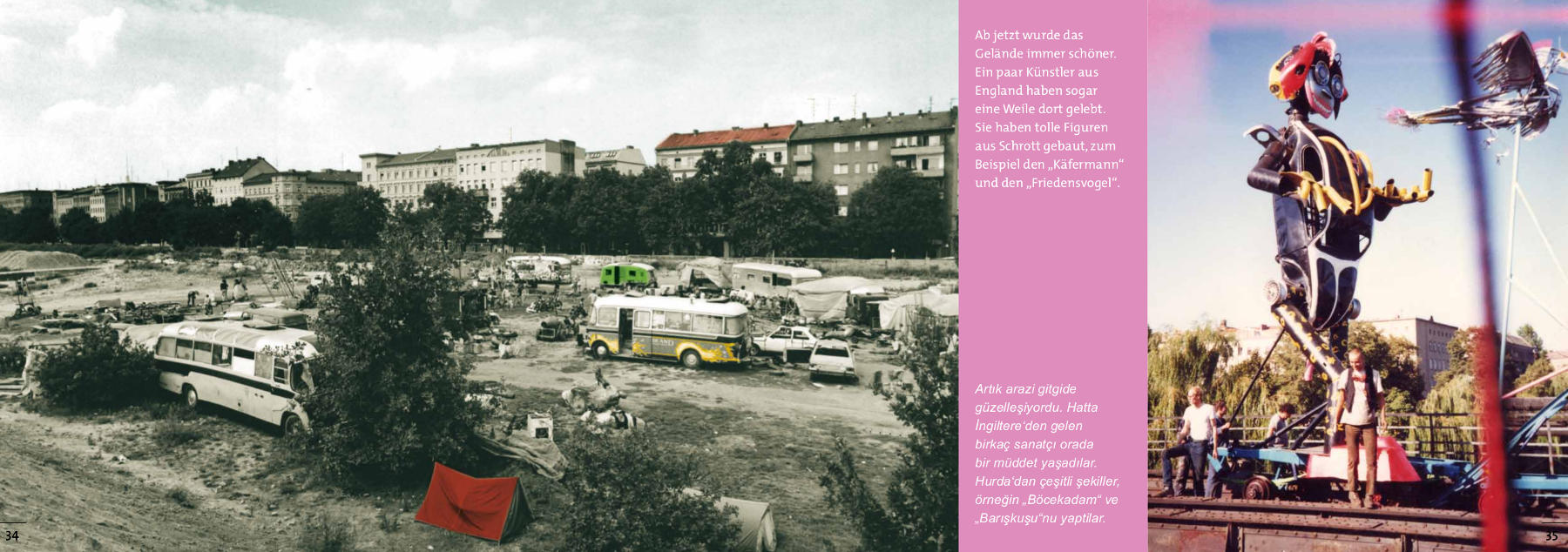 Ab jetzt wurde das Gelände immer schöner. Ein paar Künstler aus England haben sogar eine Weile dort gewohnt. Sie haben tolle Figuren aus Schrott gebaut, zum Beispiel den „Käfermann“ und den „Friedensvogel“.