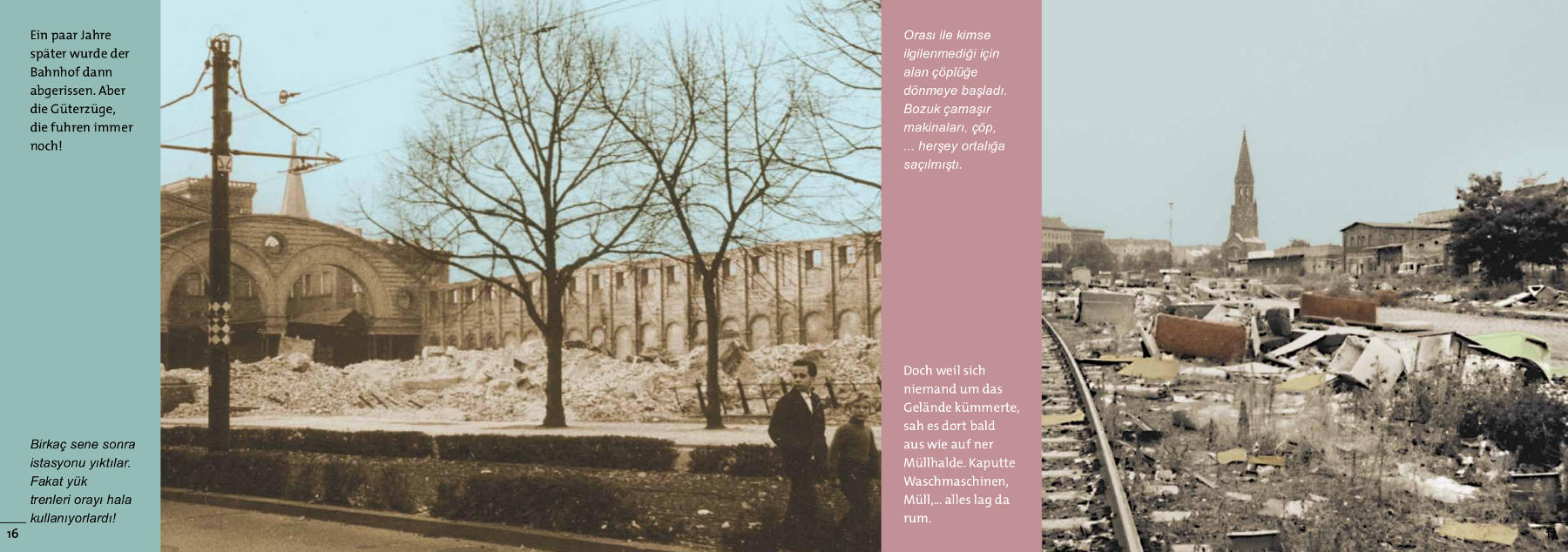 Irgendwann wurde der Bahnhof nicht mehr gebraucht und geschlossen. Nur die Güterzüge fuhren noch und die Eisenbahngesellschaft vermietete einige Flächen. So zogen immer mehr Firmen auf das Gelände: ein Kieswerk, Autowerkstätten, ein Kohlenlager, ein Gemüsehändler und ein Schrottplatz. Sogar eine kleine Moschee gab es!