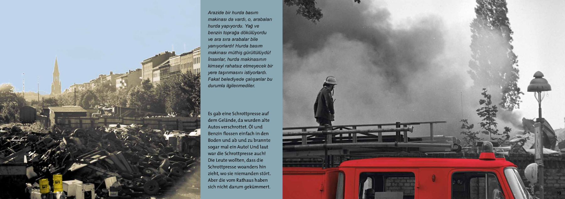 Es gab auch eine Schrottpresse auf dem Gelände, da wurden alte Autos verschrottet. Öl und Benzin flossen einfach in den Boden und ab und zu brannte sogar mal ein Auto! Und schrecklich laut war die Schrottpresse auch! Die Leute wollten, dass die Schrottpresse woanders hin zieht, wo sie niemanden stört. Doch die vom Rathaus haben sich nicht darum gekümmert.