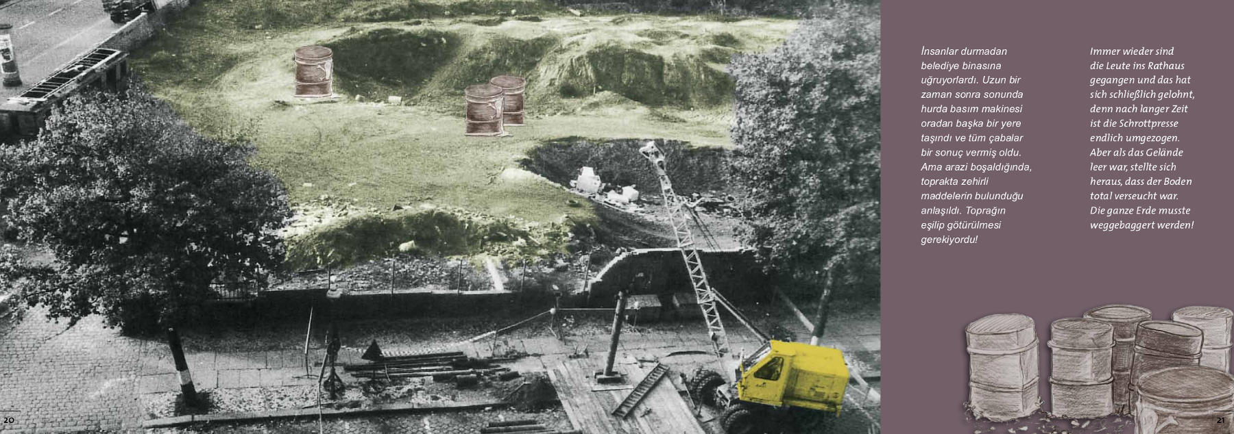 İnsanlar durmadan belediye binasına uğruyorlardı. Bu kadar uğraşmalarına değdi ve uzun bir zaman sonra sonunda hurda basım makinesi taşındı. Ama arazi boşaldığında, toprakta zehirli maddelerin bulunduğu anlaşıldı. Toprağın eşilip götürülmesi gerekiyordu!