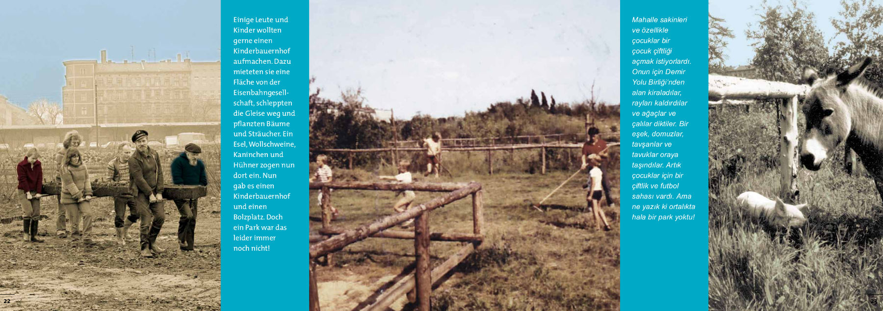 Einige Leute und Kinder wollten gerne einen Kinderbauernhof aufmachen. Dazu mieteten sie eine Fläche von der Eisenbahngesellschaft, schleppten die Gleise weg und pflanzten Bäume und Sträucher. Ein Esel, Wollschweine, Kaninchen und Hühner zogen nun dort ein. Nun gab es einen Kinderbauernhof und einen Bolzplatz. Doch ein Park war das leider immer noch nicht!