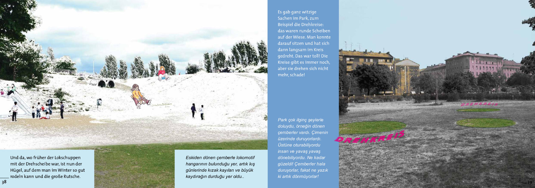 Und da, wo früher der Lokschuppen mit der Drehscheibe war, ist nun der Hügel, auf dem man im Winter so gut rodeln kann und die große Rutsche.