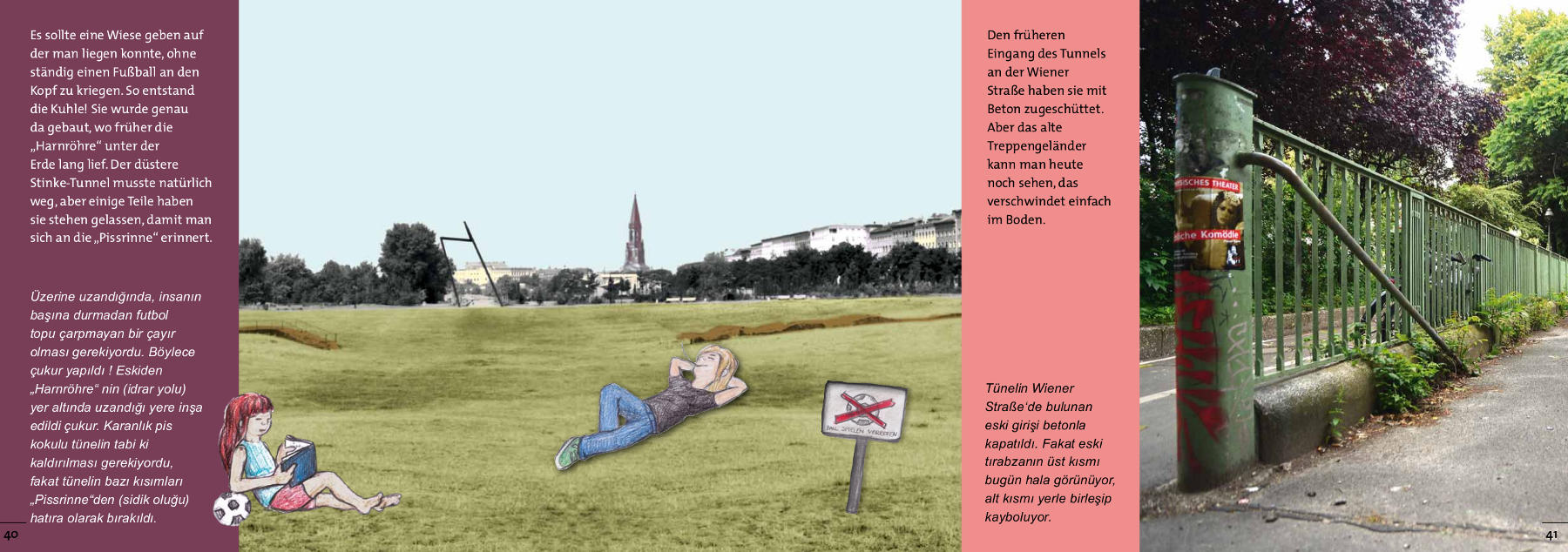 Und es sollte eine Wiese geben auf der man liegen konnte, ohne ständig einen Fußball an den Kopf zu kriegen. So entstand die Kuhle! Sie wurde genau da gebaut, wo früher die „Harnröhre“ unter der Erde lang lief. Der düstere Stinke-Tunnel musste natürlich weg, aber einige Teile haben sie stehen gelassen, damit man sich an die „Pissrinne“ erinnert.