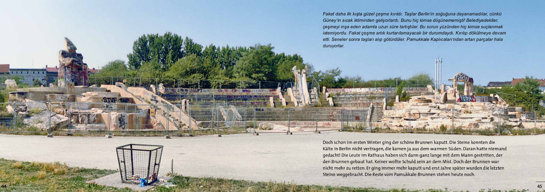 Die Leute im Rathaus haben sich dann ganz lange mit dem Mann gestritten, der den Brunnen gebaut hat. Keiner wollte Schuld sein an dem Mist. Doch der Brunnen war nicht mehr zu retten. Er ging immer mehr kaputt und erst Jahre später wurden die letzten Steine weggebracht. Die Reste vom Pamukkale-Brunnen stehen heute noch.